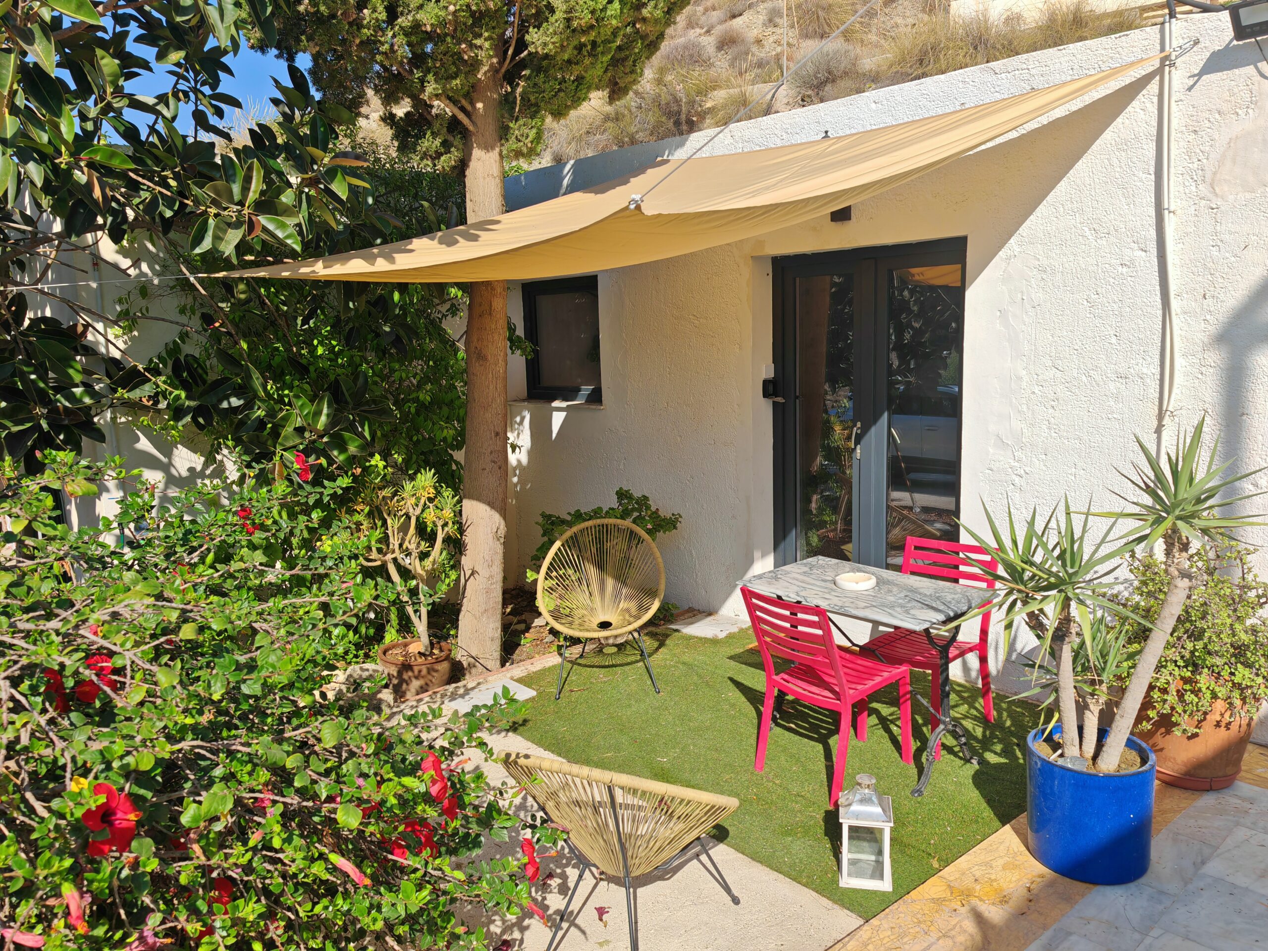 A solo 3,5 km del pueblo de Carboneras y sus playas, bonito estudio totalmente reformado y equipado, en un entorno tranquilo, con todas las comodidades y una terraza con flores orientada al sureste.