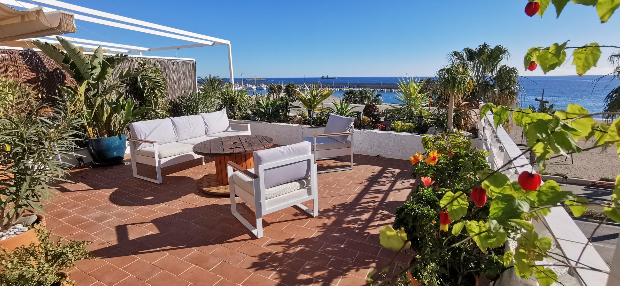 Fantastic 35 sqm terrace with plants and garden furniture, stunning sea views, marina and beautiful family sandy beach 40 meters away.