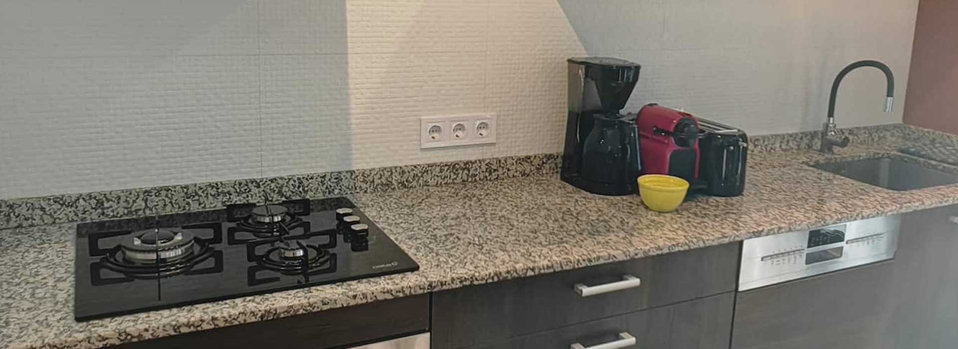 ◼️ Fully equipped kitchen-dining room with dishwasher, large fridge-freezer, microwave and traditional oven, hob, numerous kitchen utensils, Nespresso coffee machine, American coffee maker, toaster, electric kettle, and barbecue.