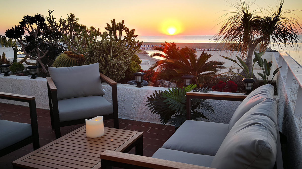 Enjoy an aperitif with friends or sip a glass of Macabeo wine overlooking the Alborán Sea from the flower-filled terrace of the apartments.